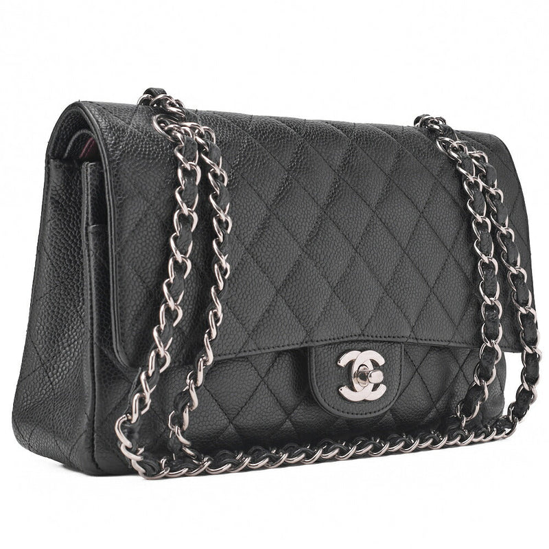 Pre-Owned Kette Schultertasche Matelassé Doppelklappe Kaviar Haut Schwarz Silberfarbene Hardware Pre-Owned