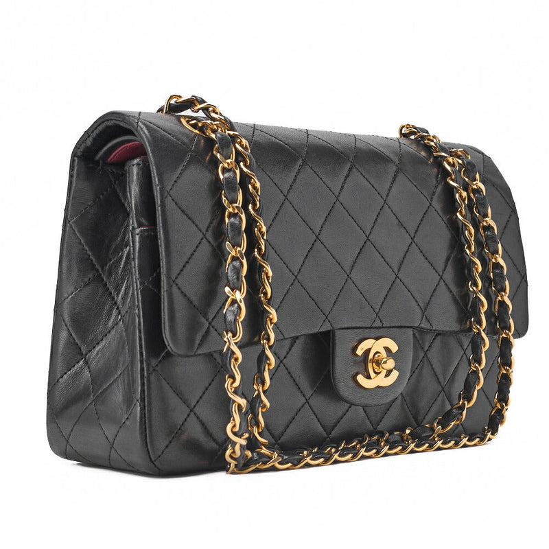 Pre-Owned Kette Schultertasche Matelassé Doppelklappe Lammleder Schwarz Goldfarbene Hardware Pre-Owned