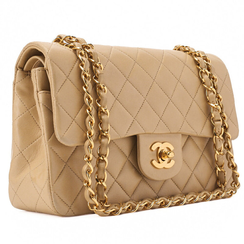Pre-Owned Kette Schultertasche Matelassé Doppelklappe Lammleder Beige Goldfarbene Hardware Pre-Owned