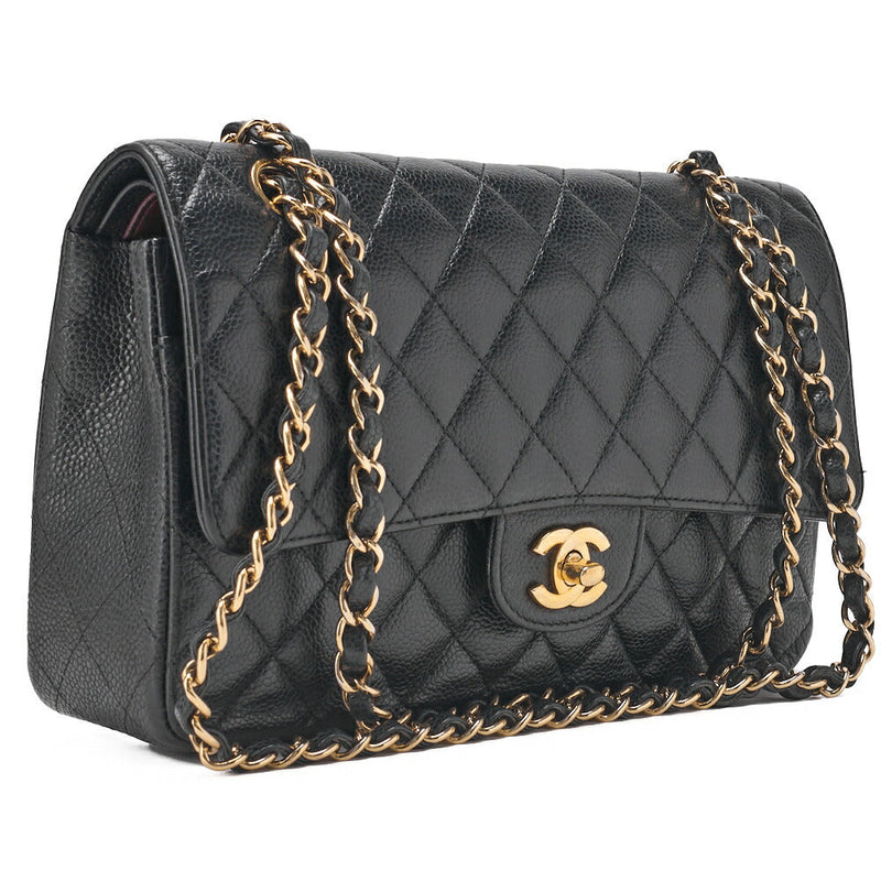 Gebrauchte Umhängetasche, Matelassé-Drehverschluss mit doppelter Klappe, Kaviarhaut, Schwarz, goldfarbene Metallteile, gebraucht