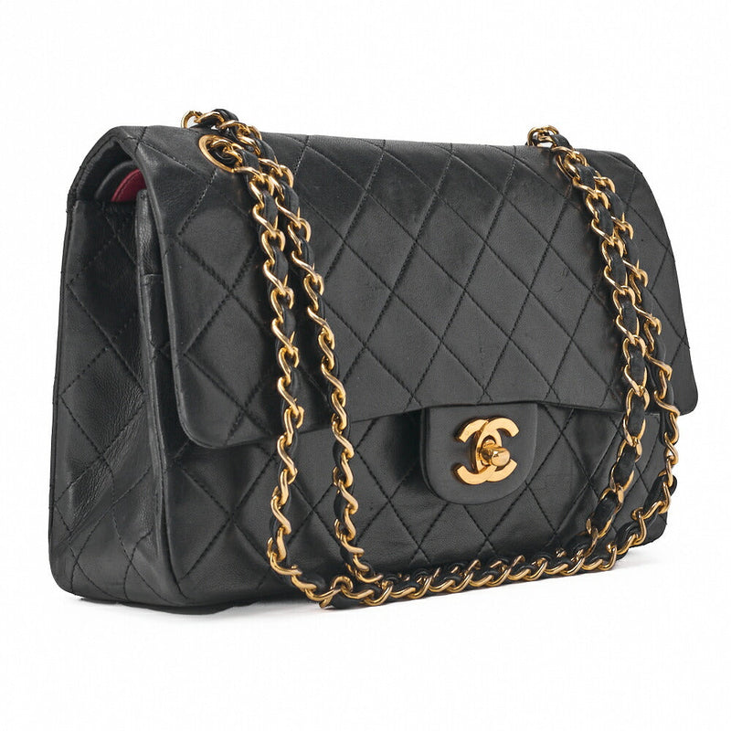 Pre-Owned Schultertasche Matelasse 23 Doppelklappe Kette Lammleder Schwarz Goldfarbene Hardware Pre-Owned