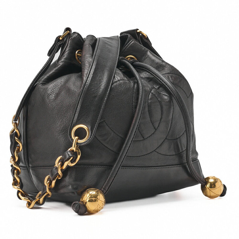 Gebrauchte Umhängetasche mit Kordelzug Typ Coco Mark Lammleder Schwarz Goldfarbene Hardware Gebraucht