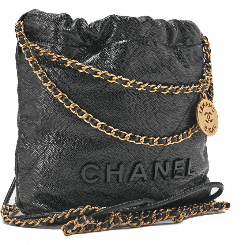 Gebrauchte Rucksacktasche mit Kette, Matelassé, Drehverschluss, Kaviarhaut, Schwarz, goldfarbene Metallteile, gebraucht