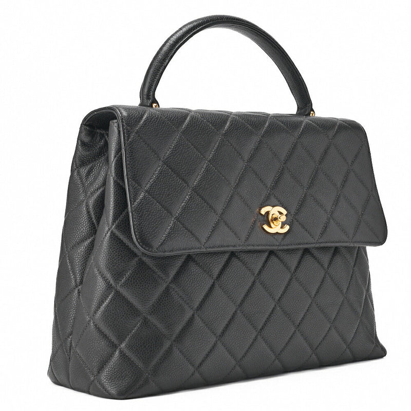 Gebrauchte Handtasche Matelassé Drehverschluss Kaviarhaut Schwarz Goldfarbene Hardware Gebraucht