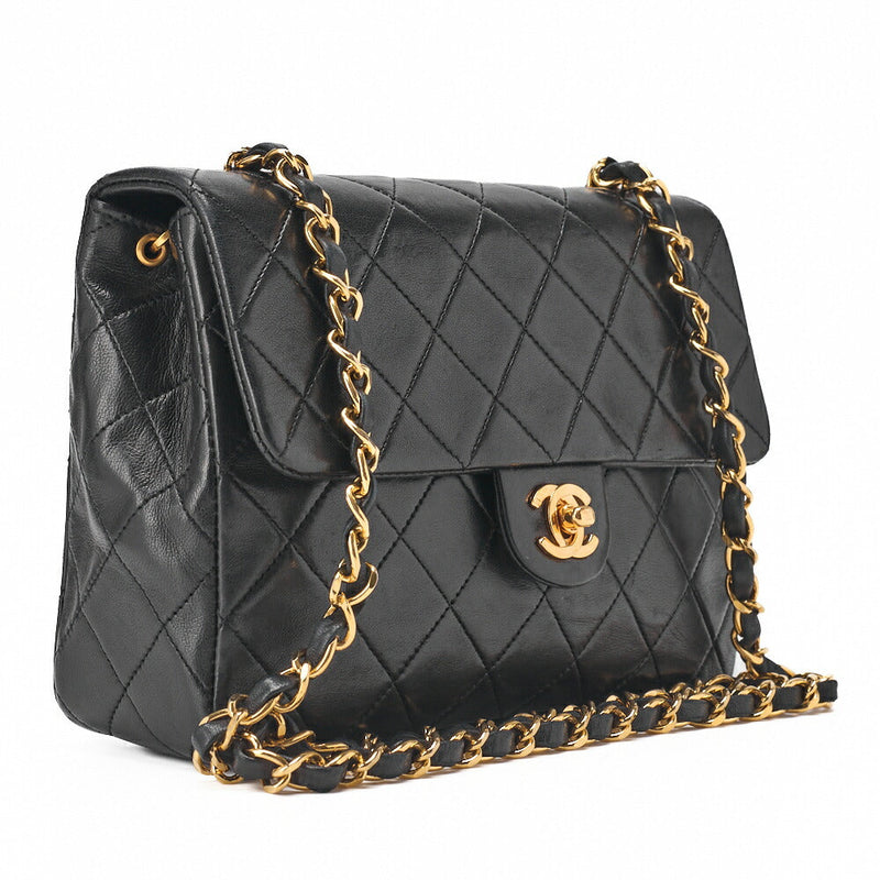 Pre-Owned Kette Schultertasche Matelassé Doppelklappe Lammleder Schwarz Goldfarbene Hardware Pre-Owned