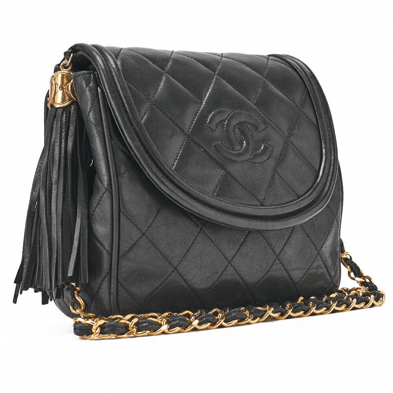 Pre-Owned Umhängetasche Matelassé Außenklappe Fransen Kette Schulter Lammleder Schwarz Goldfarbene Hardware Pre-Owned