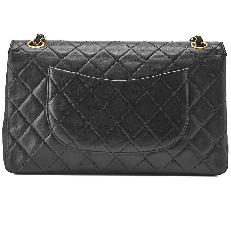 Gebrauchte Schultertasche mit Kette, Coco Mark, durchgehender Klappverschluss mit Druckverschluss, Lammleder, Schwarz, goldfarbene Metallteile, gebraucht