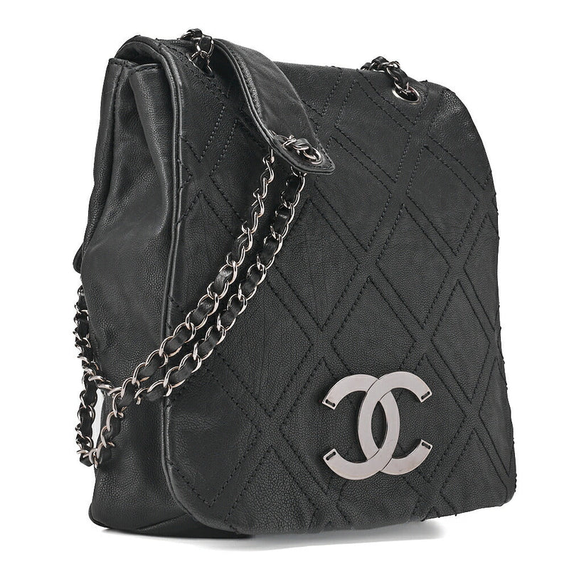Gebrauchte Umhängetasche, Kettenschulter, Matelassé, Kaviarhaut, Schwarz, silberfarbene Metallteile, Gebraucht