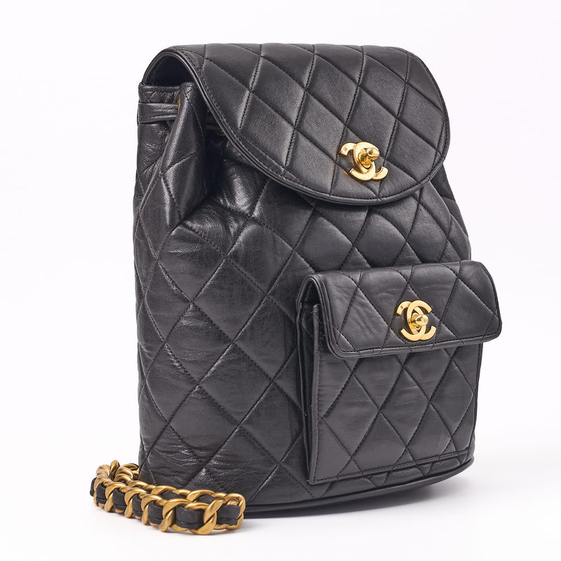 Gebrauchte Rucksacktasche mit Kette, Matelassé-Außenklappe, Drehverschluss, Lammleder, schwarz, goldfarbene Hardware, gebraucht