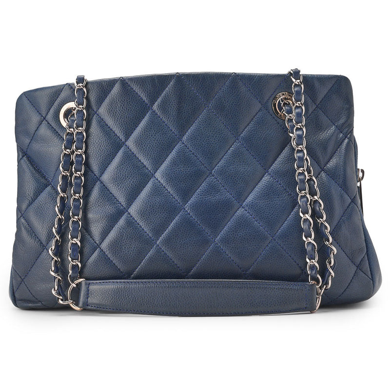 Gebrauchte Umhängetasche, Matelassé, Kaviarhaut, Marineblau, Silberfarbene Metallteile, Gebraucht