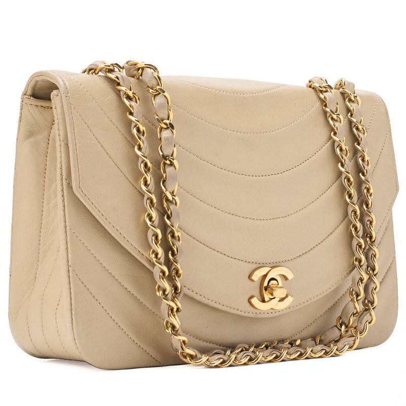 Pre-Owned Umhängetasche Matelassé Border Stitch Kette Schulter Lammleder Beige Gold-Ton Hardware Pre-Owned