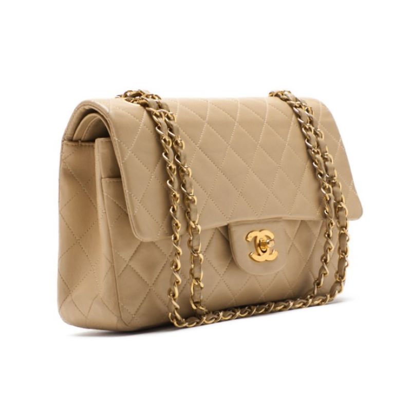Pre-Owned Umhängetasche Matelassé Doppelklappe Kette Schulter Lammleder Beige Goldfarbene Hardware Pre-Owned