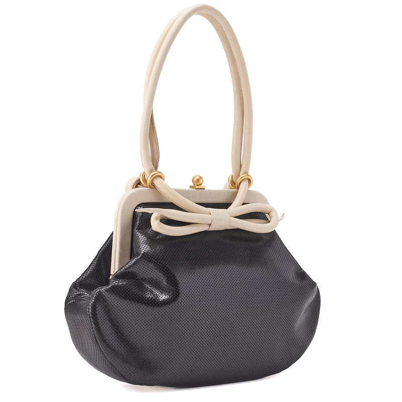 Gebrauchte Schultertasche Gamaguchi Perforiertes Leder Schwarz Goldfarbene Hardware Gebraucht