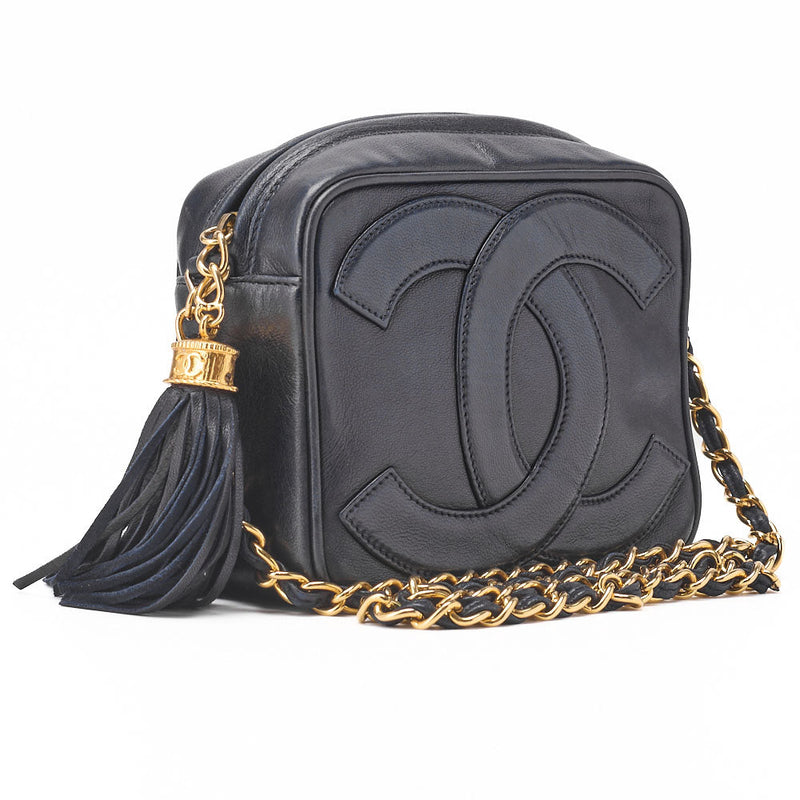 Gebrauchte Umhängetasche, Coco Mark Fransenkette am Schultergurt, Lammleder, Schwarz, goldfarbene Metallteile, gebraucht