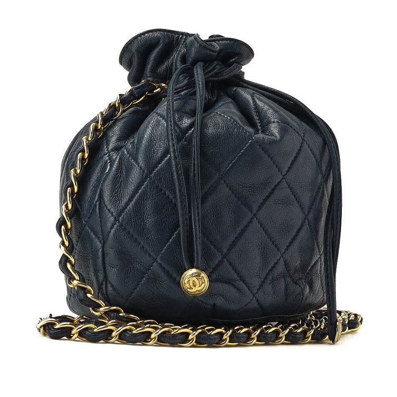 Gebrauchte Umhängetasche Matelassé Kordelzug Typ Kette Schulter Lammleder Marine Gold-Ton Hardware Gebraucht