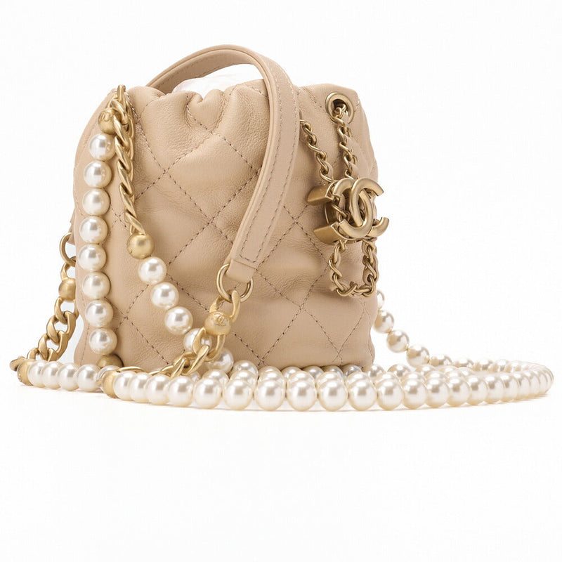 Pre-Owned Mini-Umhängetasche, Matelassé, Perlenkette, Lammleder, Weiß, goldfarbene Hardware, Pre-Owned