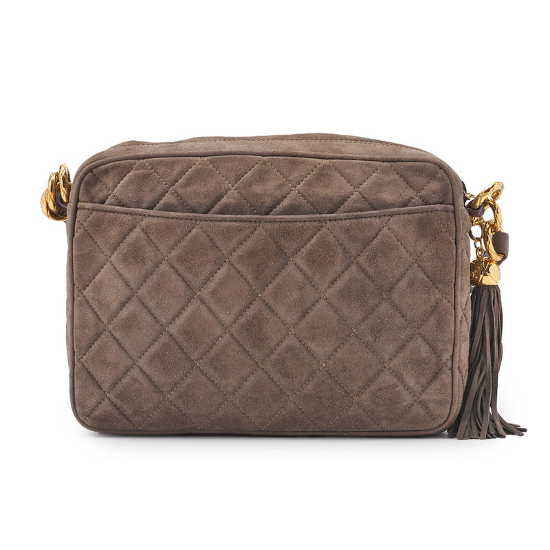 Gebrauchte Umhängetasche, Matelassé, Fransen, Wildleder, Graubeige, Goldfarbene Metallteile, Gebraucht
