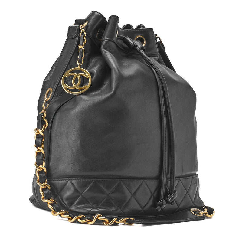 Gebrauchte Umhängetasche, Kordelzugtyp, Lammleder, Schwarz, Goldfarbene Hardware, Gebraucht