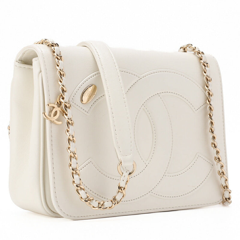 Gebrauchte Umhängetasche, Coco Mark mit Anhänger, Schulterkette, Kalbsleder, Weiß, goldfarbene Metallteile, gebraucht