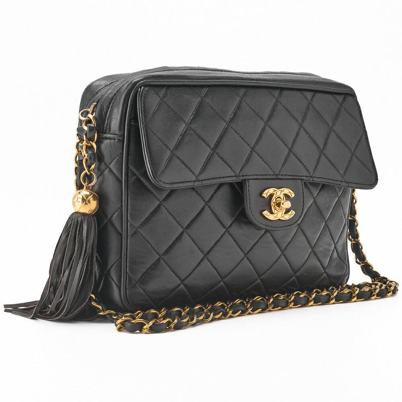 Pre-Owned Umhängetasche Matelassé Außenklappe Fransen Kette Schulter Lammleder Schwarz Goldfarbene Hardware Pre-Owned