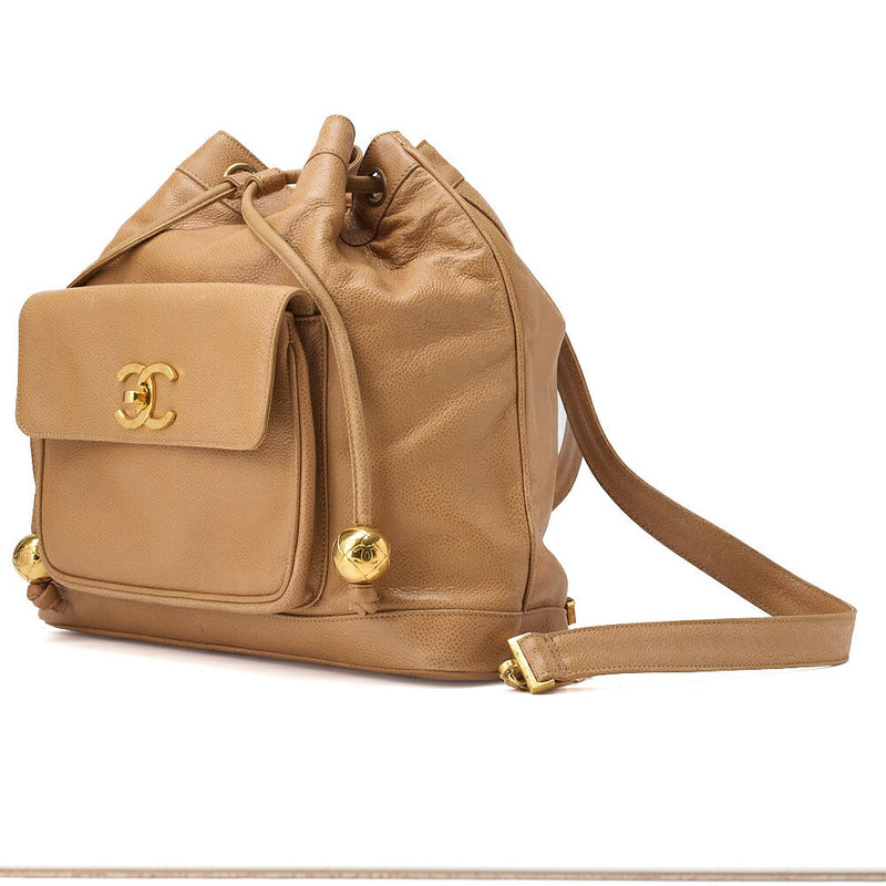 Gebrauchte Schulter-Rucksacktasche Außenklappe Kordelzug Typ Kaviarhaut Beige Goldfarbene Hardware Gebraucht