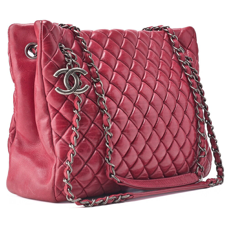 Gebrauchte Umhängetasche, Matelassé, Schulterkette, Glitzerleder, Rot, Silberfarbene Metallteile, Gebraucht