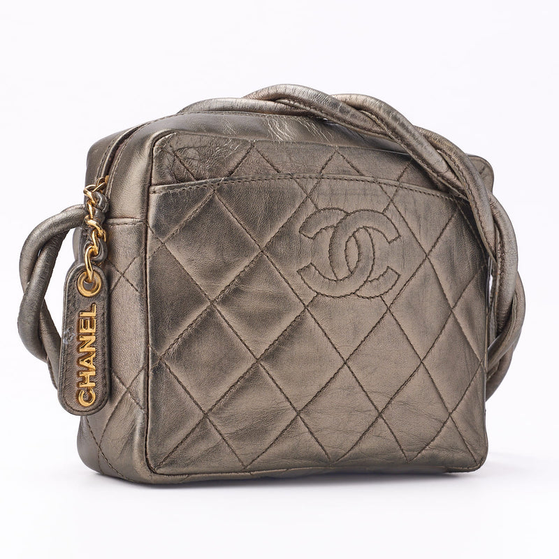 Gebrauchte Umhängetasche, Matelassé, Coco Mark, Lammleder, Silber-Gold, Goldfarbene Hardware, Gebraucht
