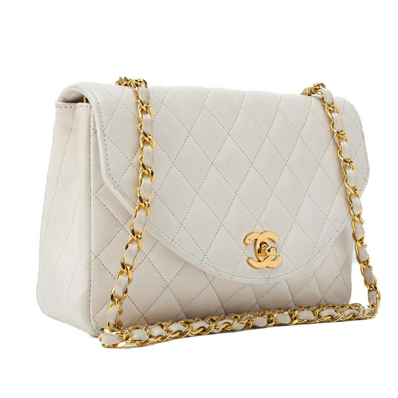 Gebrauchte Umhängetasche, Kettenschulter, Matelassé, Lammleder, Weiß, Goldfarbene Hardware, Gebraucht