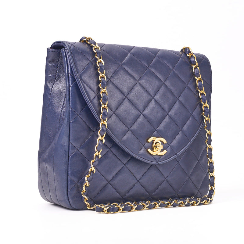 Gebrauchte Umhängetasche, Matelassé-Drehverschluss, runde Klappe, Lammleder, Marineblau, goldfarbene Metallteile, gebraucht