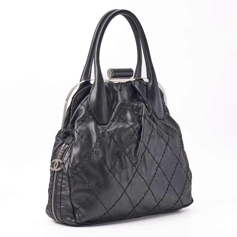 Gebrauchte Tragetasche Gamaguchi Wild Stitch Kalbsleder Schwarz Silberfarbene Hardware Gebraucht