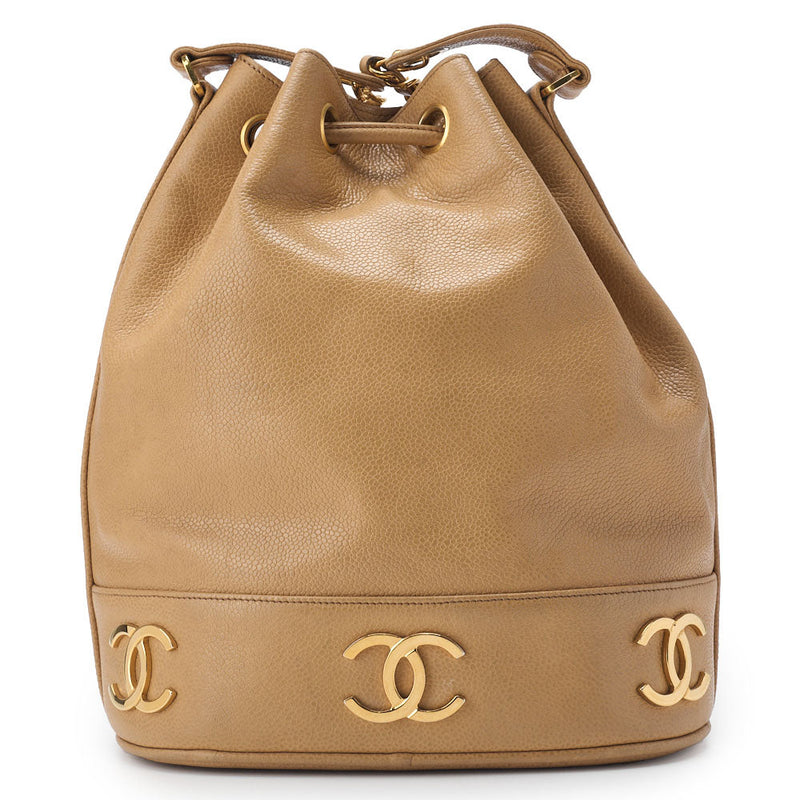 Pre-Owned Chain Shoulder Bag Triple Coco Drawstring Caviar Skin Beige Gold-Tone Hardware Pre-Owned