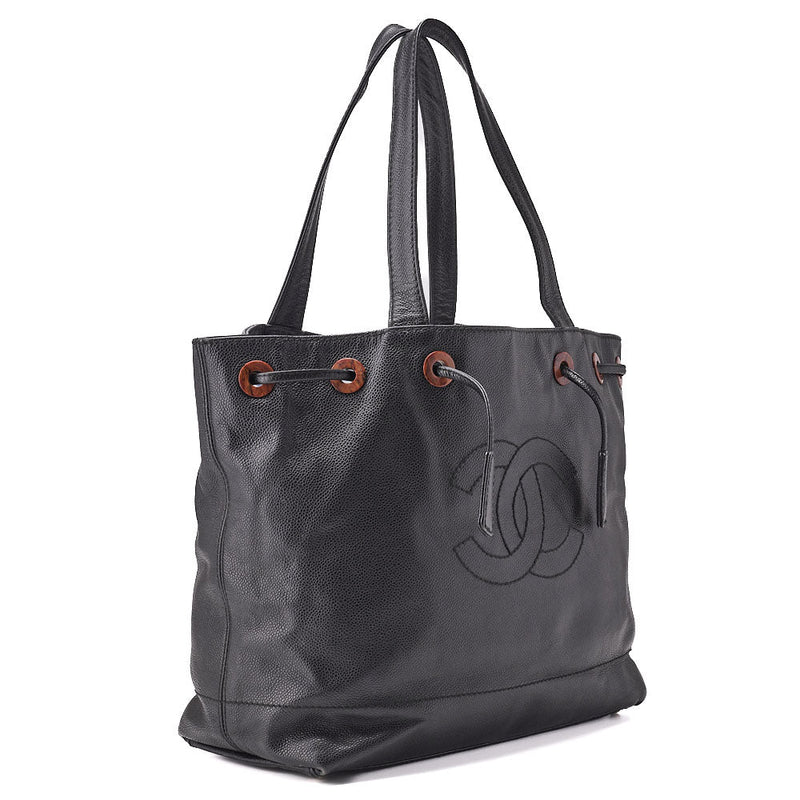 Gebrauchte Umhängetasche Coco Mark Kordelzug Kaviarhaut Holzmuster Goldfarbene Hardware Gebraucht