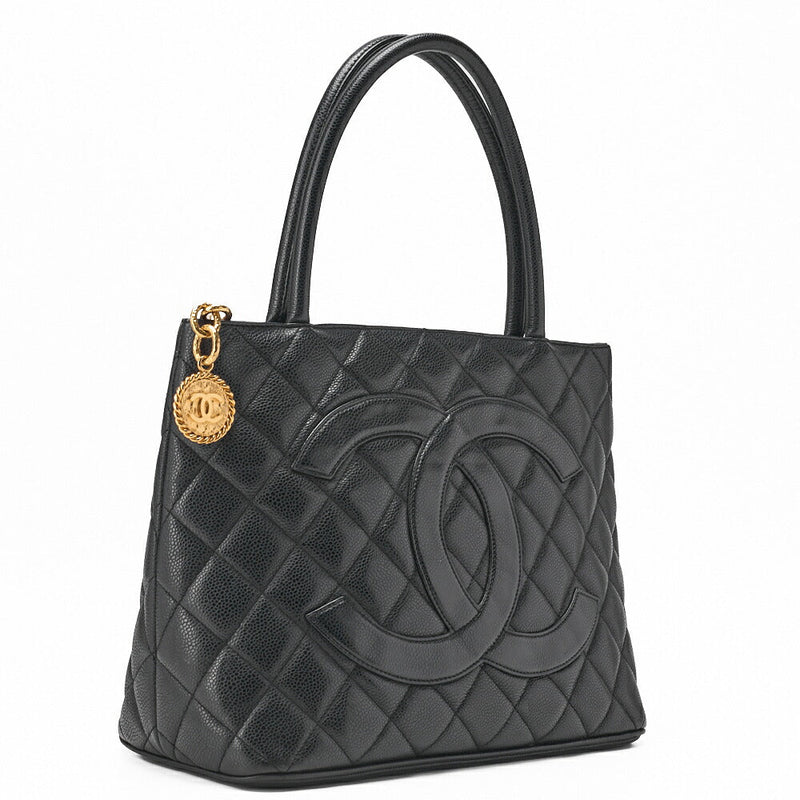 Gebrauchte Tragetasche, Matelassé-Nachdruck, Kaviarhaut, Schwarz, goldfarbene Metallteile, gebraucht