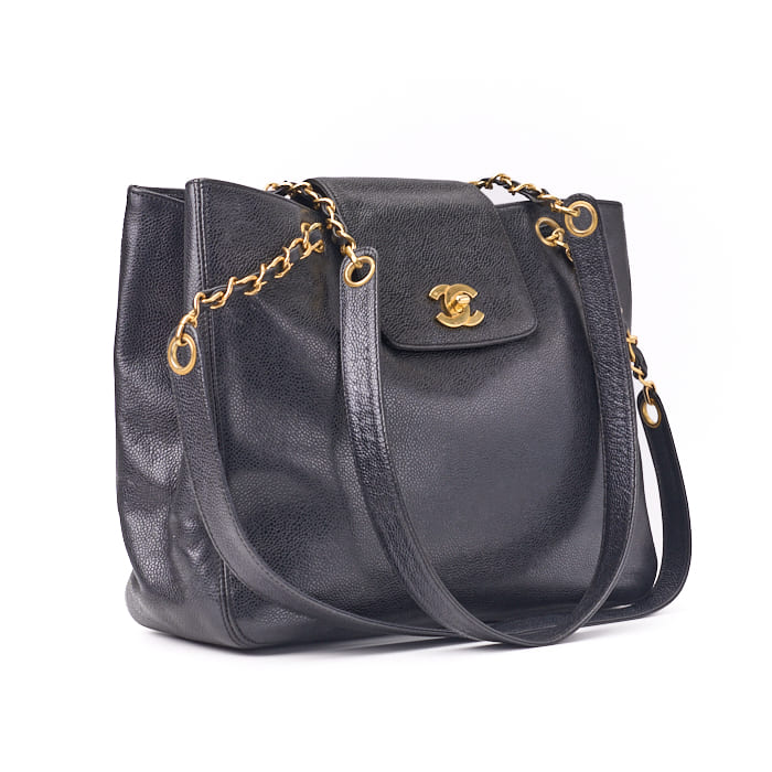 Gebrauchte Tragetasche, Drehverschluss, doppelte Schulterkette, Kaviarhaut, Schwarz, goldfarbene Metallteile, gebraucht