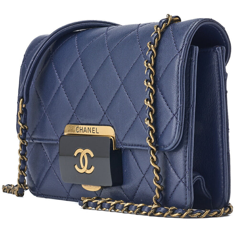 Pre-Owned Schultertasche Matelassé Druckverschluss Kalbsleder Marine Goldfarbene Metallteile Pre-Owned