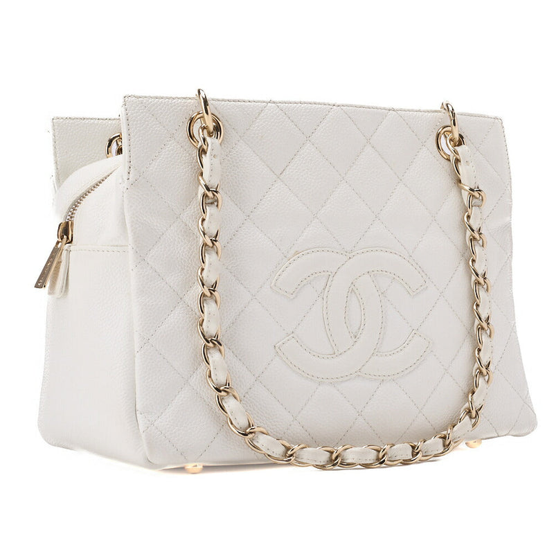 Gebrauchte Tragetasche, Matelassé, Coco Mark, Kaviarhaut, Weiß, Goldfarbene Metallteile, Gebraucht
