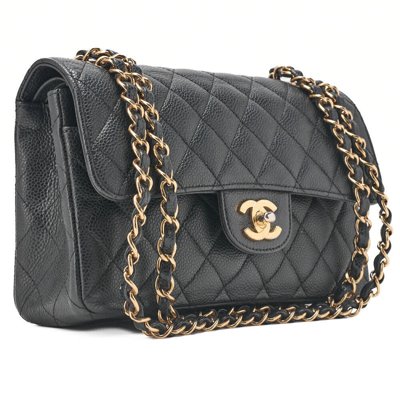 Pre-Owned Schultertasche Matelassé Drehverschluss Doppelklappe Kaviarhaut Schwarz Goldfarbene Hardware Pre-Owned
