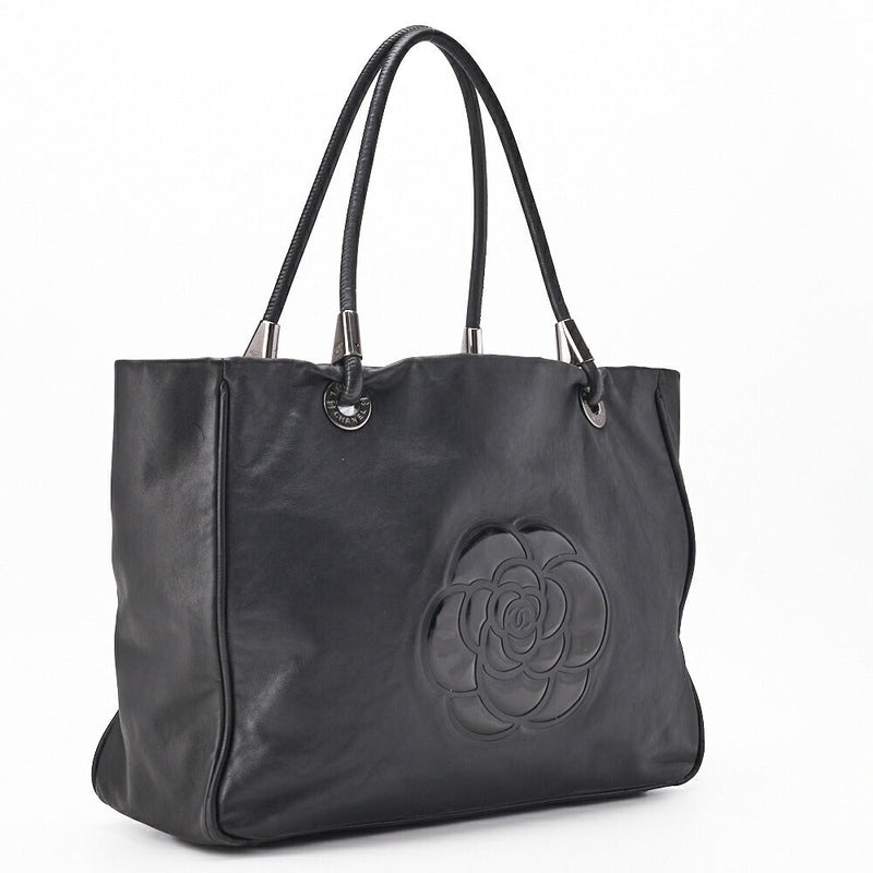 Gebrauchte große Tragetasche Camellia Line Lammleder Schwarz Silberfarbene Hardware Gebraucht