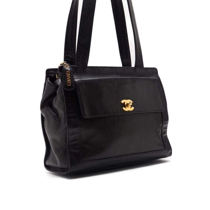 Gebrauchte Umhängetasche, Coco Mark Außenklappe, Lammleder, Schwarz, Goldfarbene Metallteile, Gebraucht