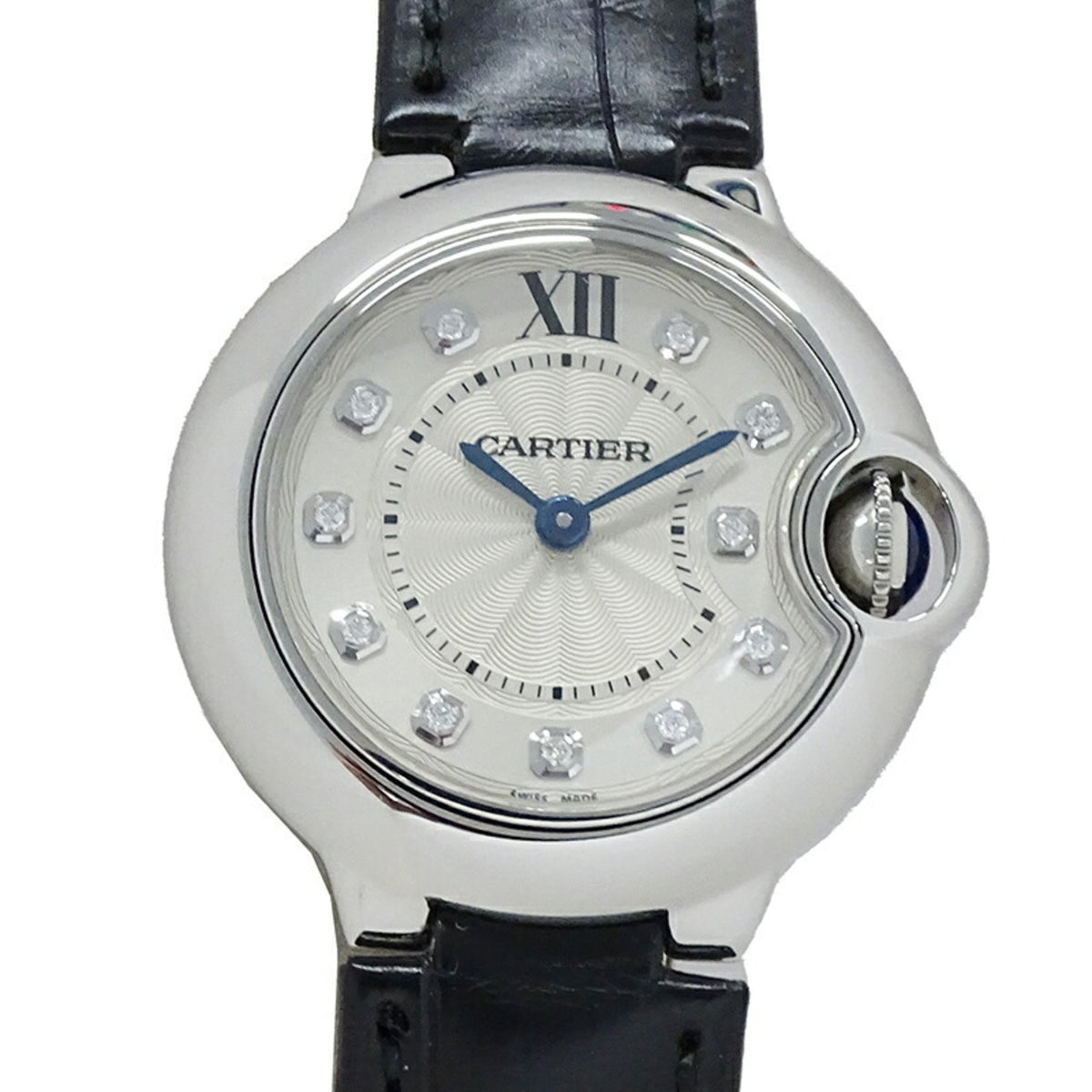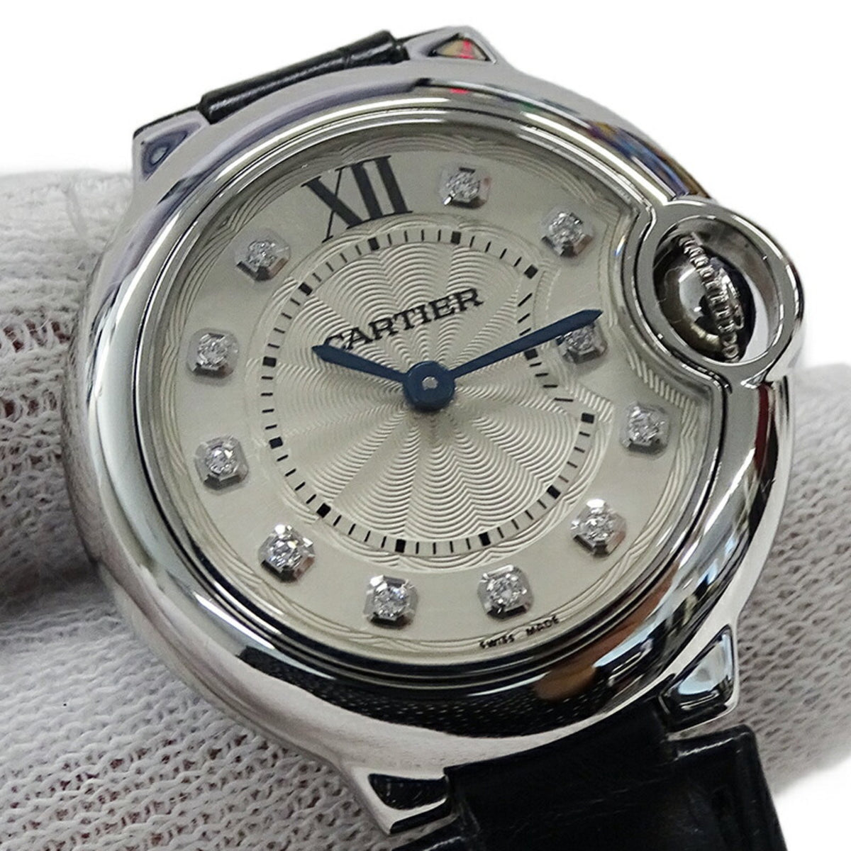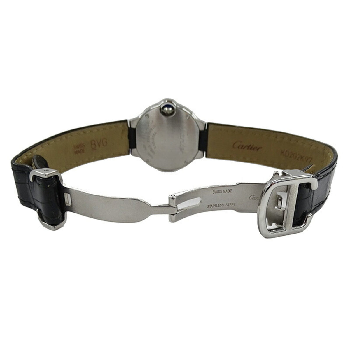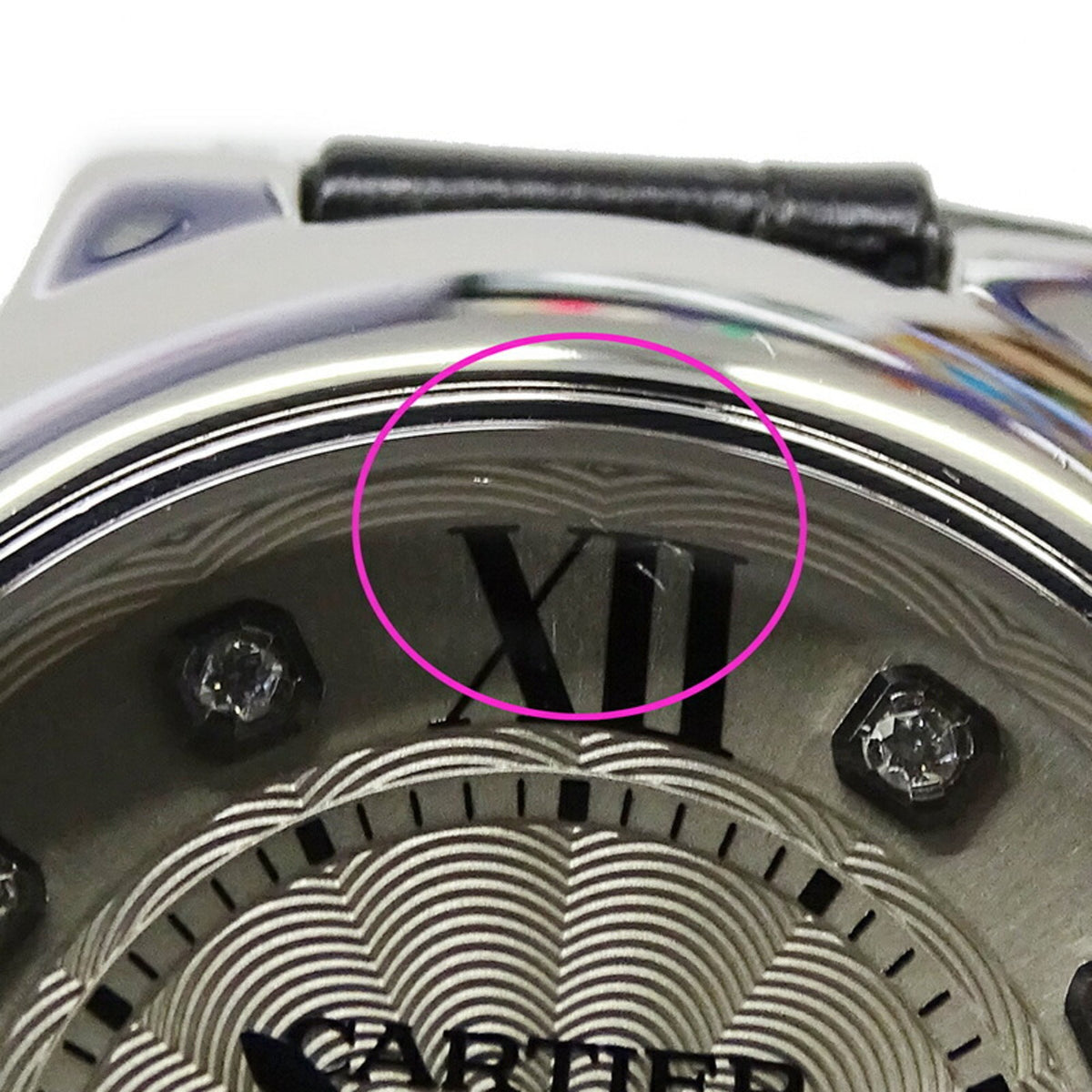 Gebrauchte Cartier Damenuhr Ballon Bleu 11P Diamant Quarz Edelstahl SS Leder W4BB0008 Rund Silber Schwarz Poliert
