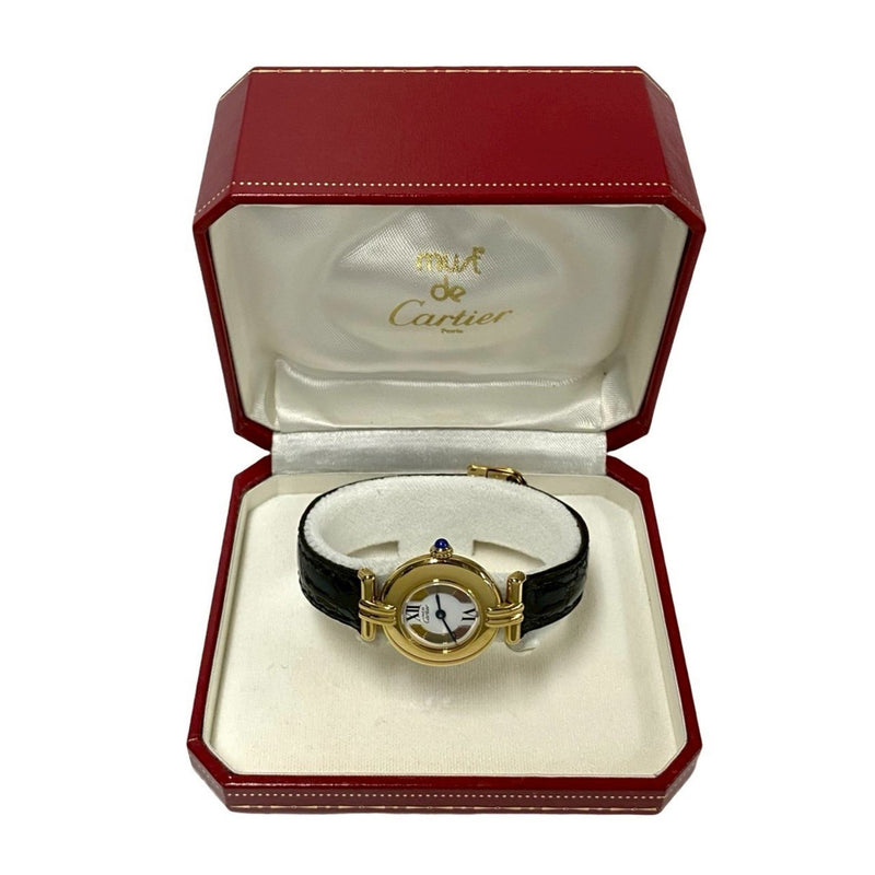 Pre-Owned CARTIER Must Colisee Vermeil Silver 925 Leather Quartz Watch in Black and Gold (28031)