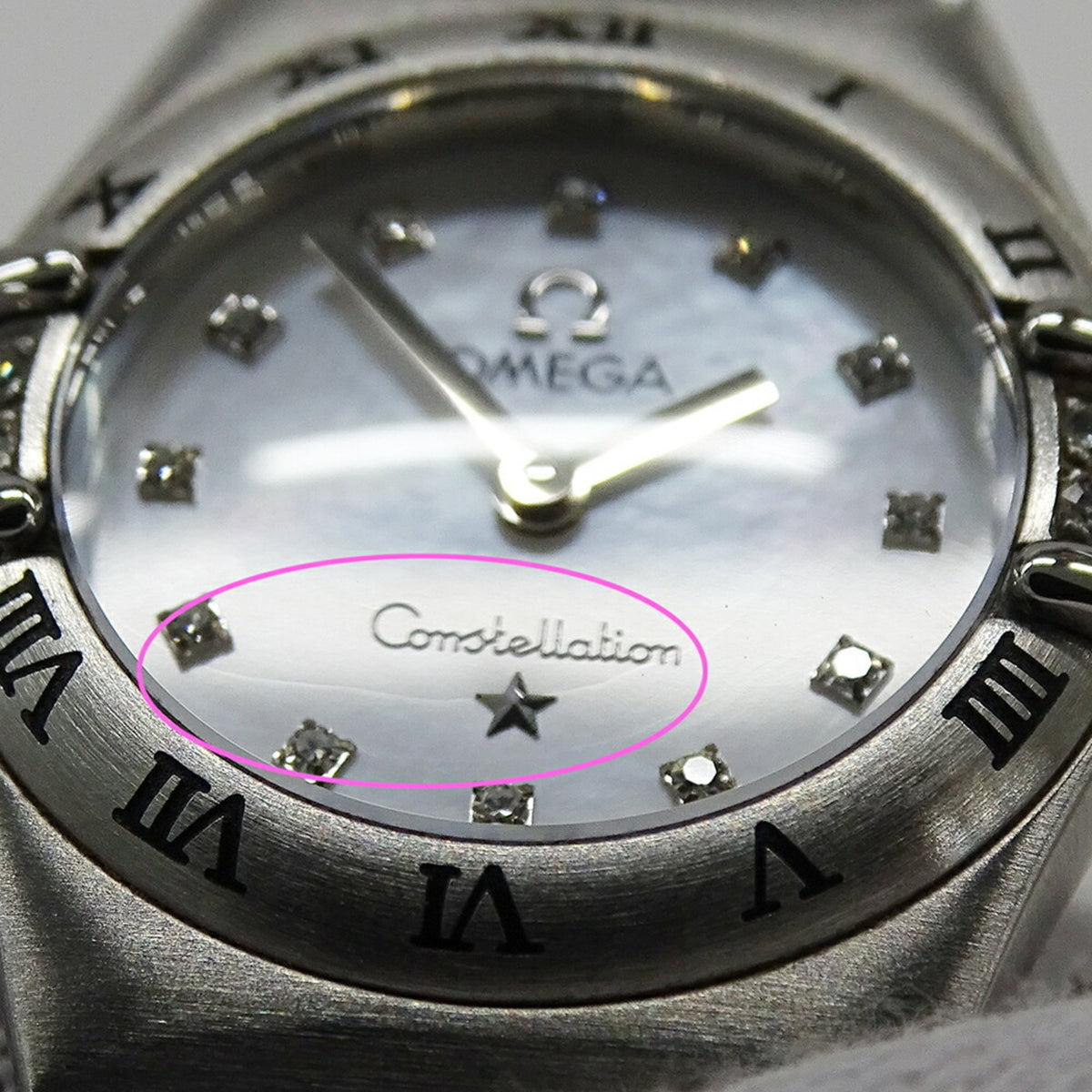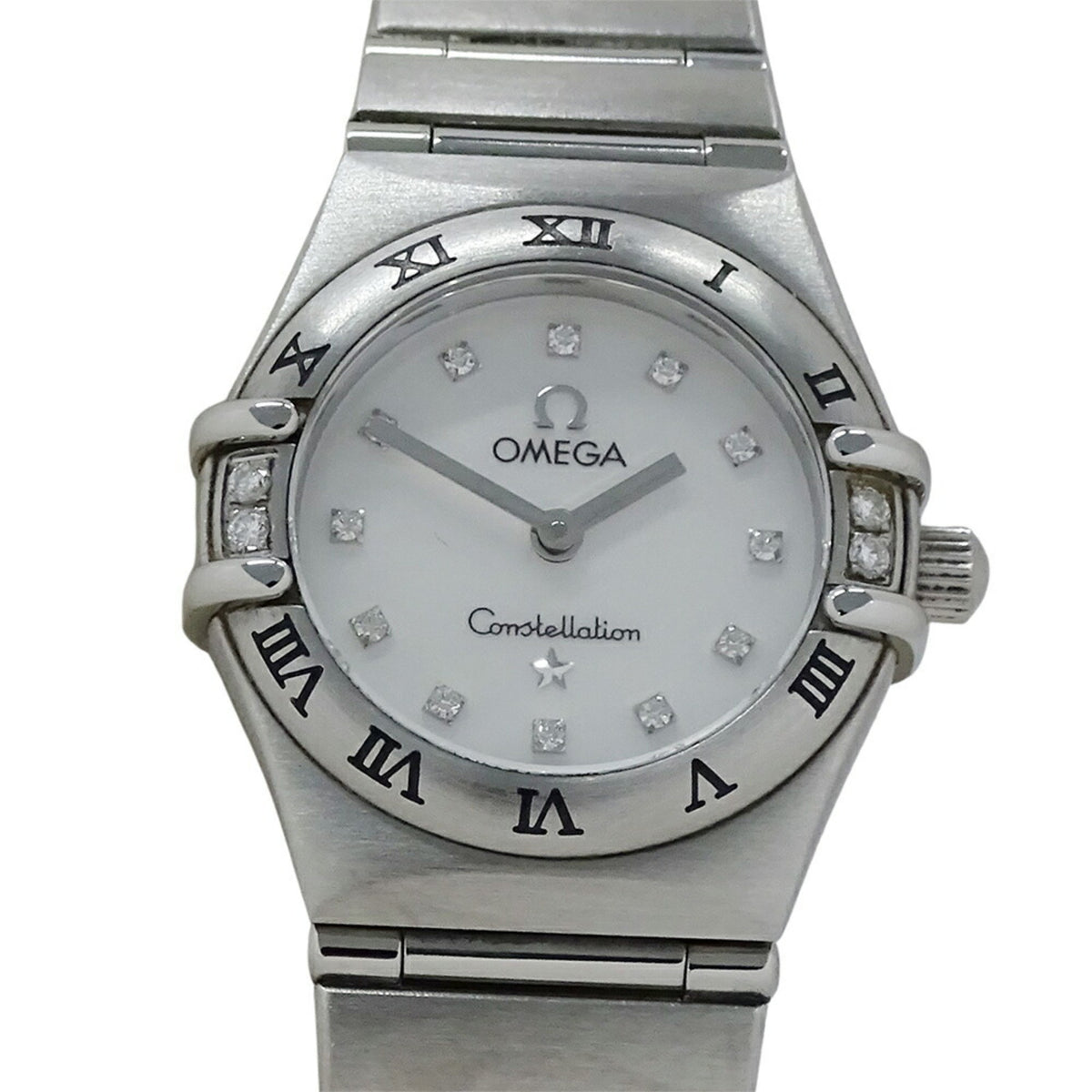 Gebrauchte OMEGA Constellation Mini 1567.76 Uhr für Damen, 12P-Lünette, Diamant, weißes Gehäuse, Quarz, Edelstahl, SS, Silber, poliert
