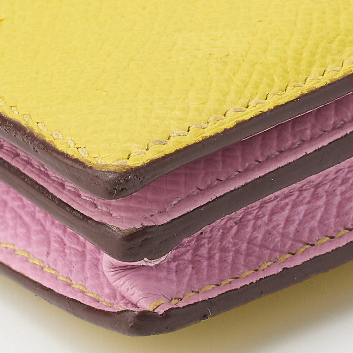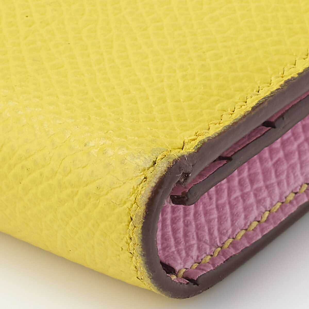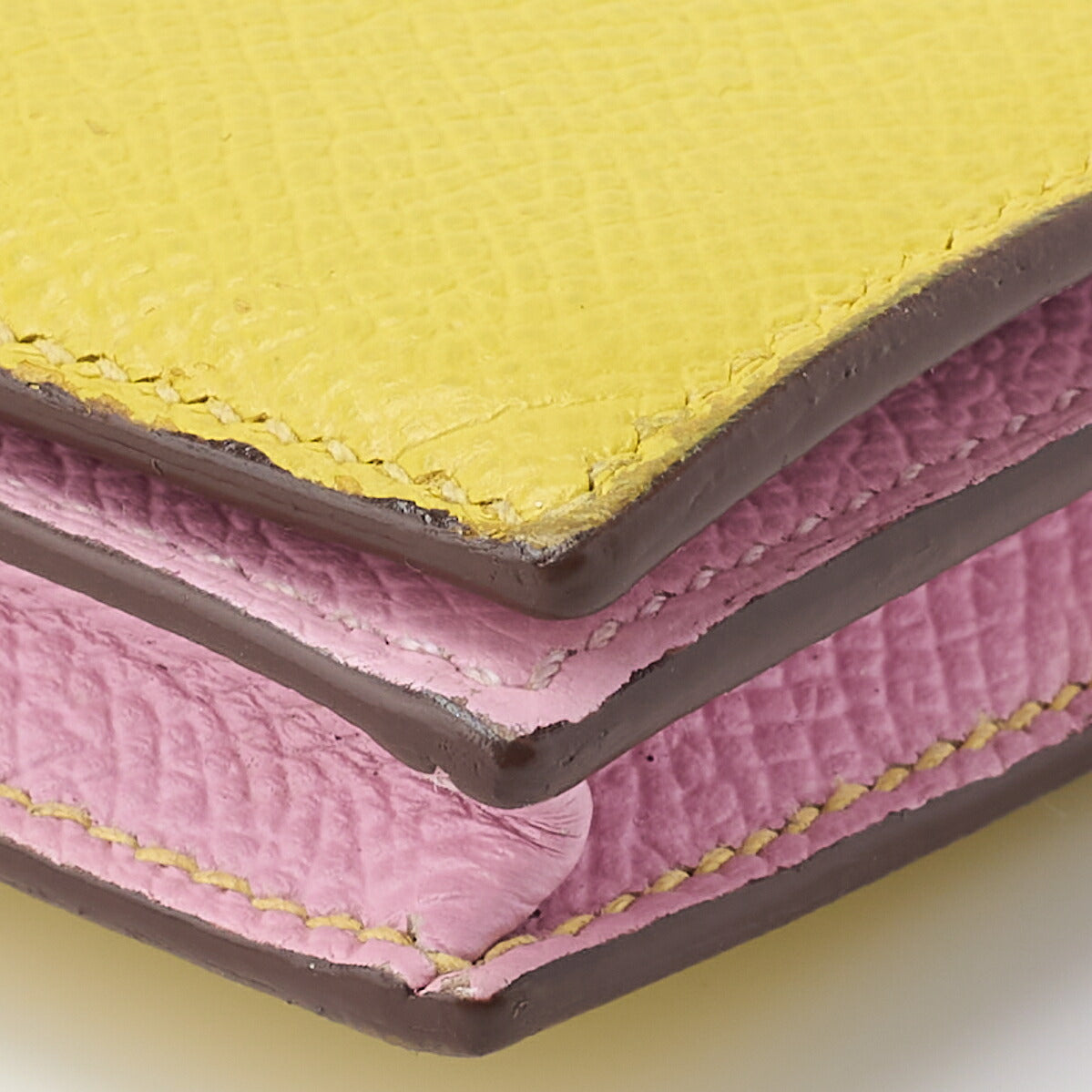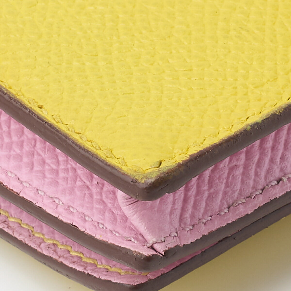 Erweitern Sie Ihre Accessoire-Kollektion mit der HERMES Hermes Bearn Soufflet Two-Fold Long Wallet aus atemberaubendem zweifarbigem Vaux Epson Leder. Diese luxuriöse Geldbörse in schicker Gelb- und Pink- Kombination mit eleganten Silberbeschlägen ist die perfekte Kombination aus Stil und Funktionalität.