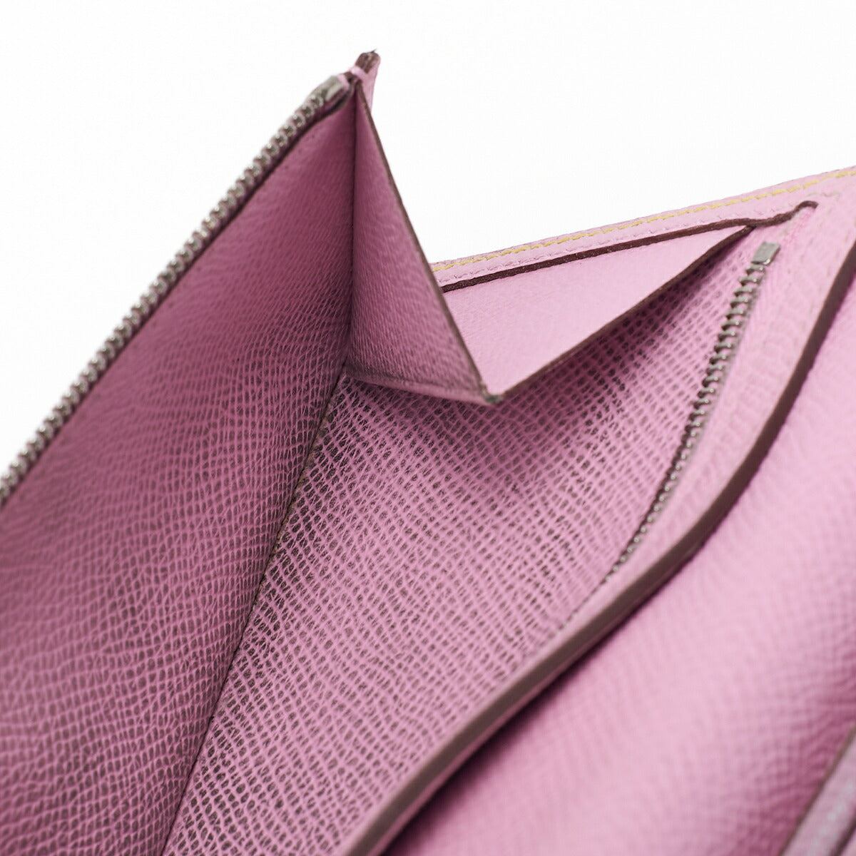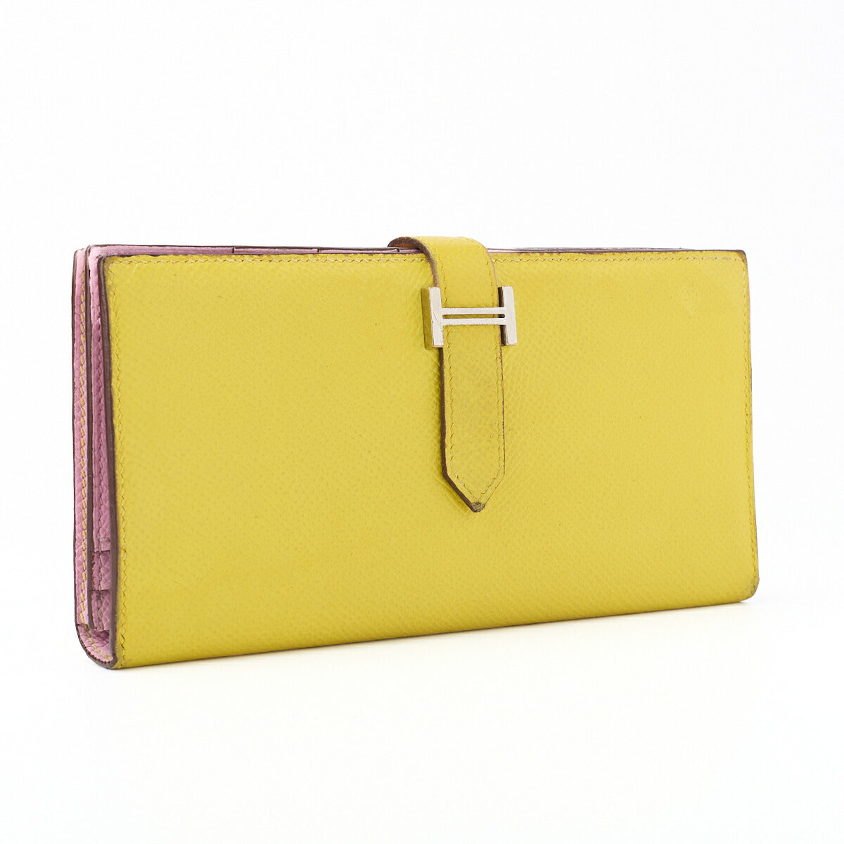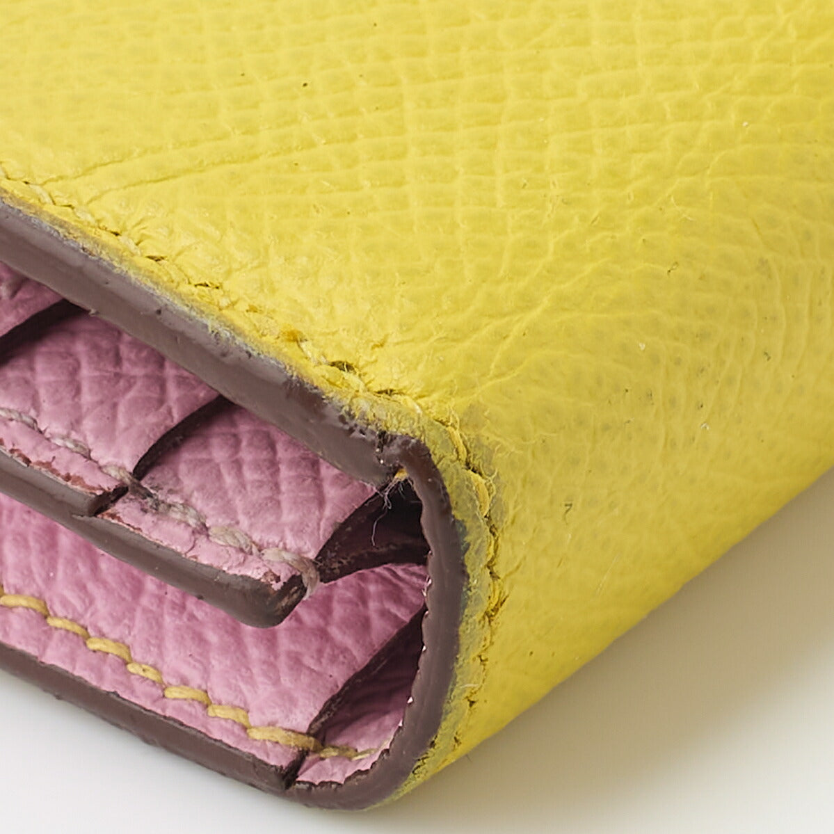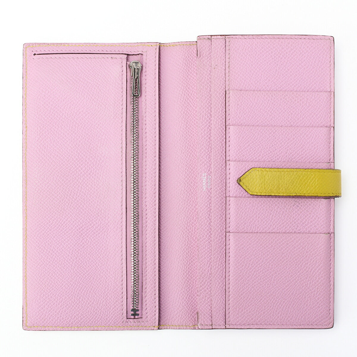 Erweitern Sie Ihre Accessoire-Kollektion mit der HERMES Hermes Bearn Soufflet Two-Fold Long Wallet aus atemberaubendem zweifarbigem Vaux Epson Leder. Diese luxuriöse Geldbörse in schicker Gelb- und Pink- Kombination mit eleganten Silberbeschlägen ist die perfekte Kombination aus Stil und Funktionalität.