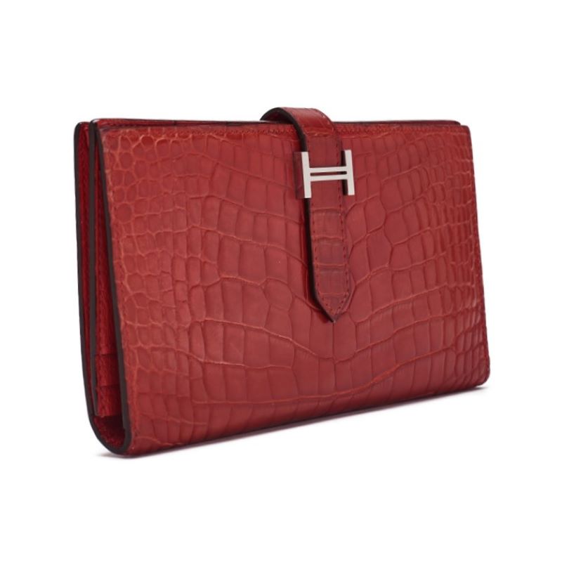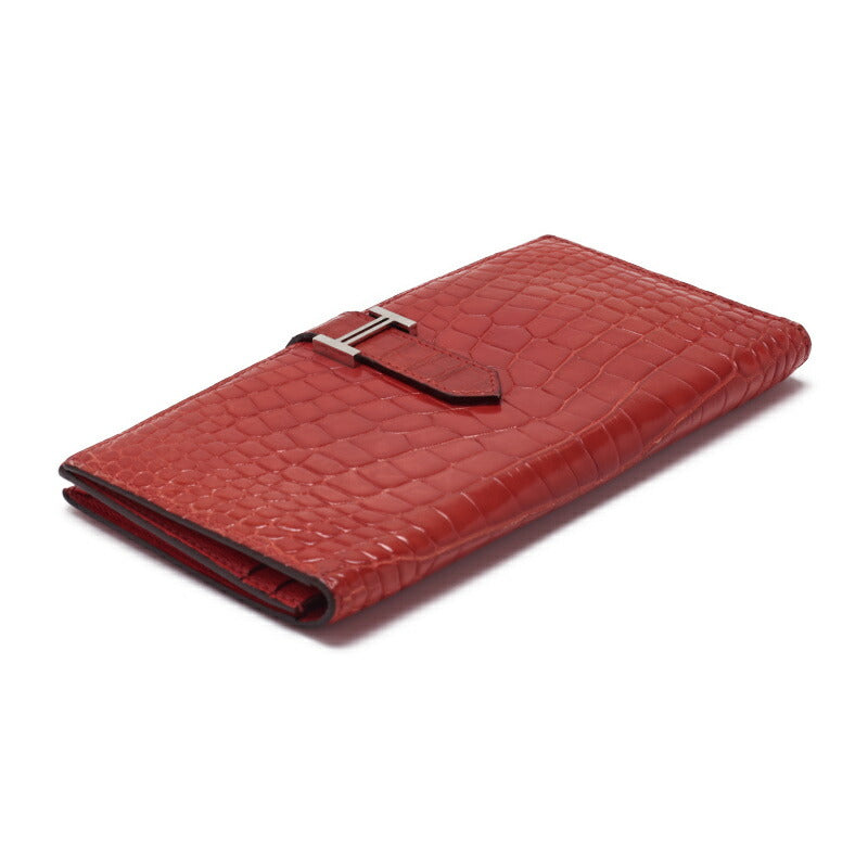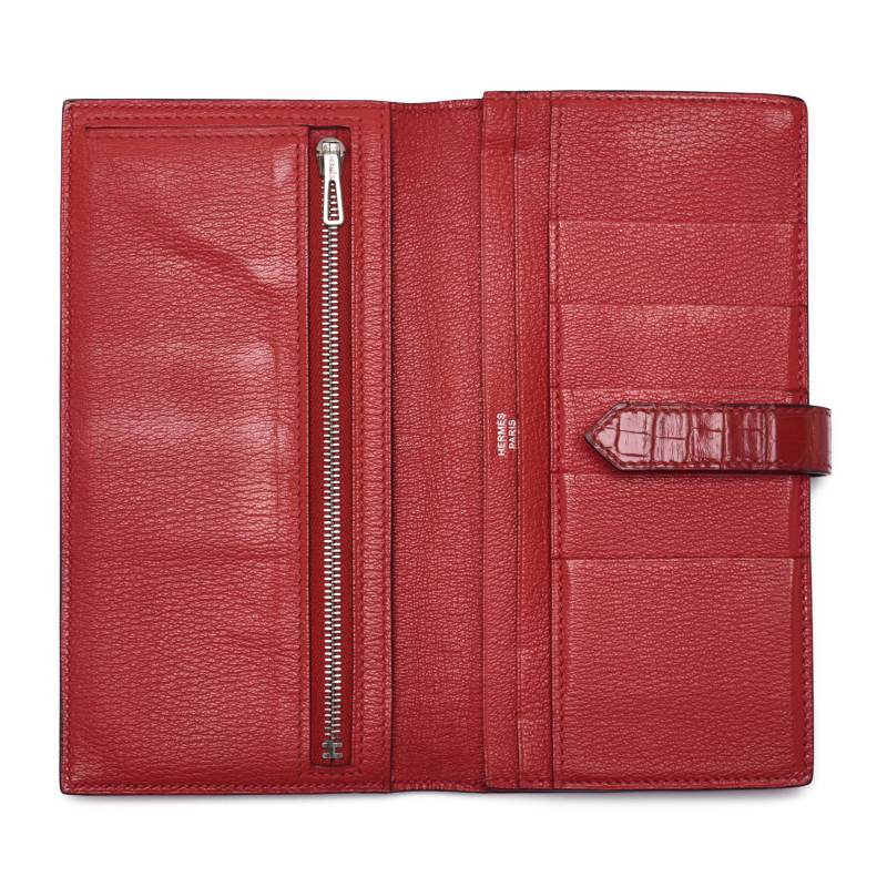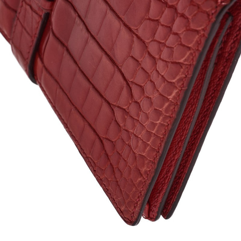 Verwöhnen Sie sich mit dem luxuriösen Charme der HERMES Hermes Bearn Soufflet 2 Fold Long Wallet . Aus luxuriösem Alligatorleder in einem auffälligen Blaze Raise- Farbton gefertigt, ist diese Geldbörse nicht nur ein Accessoire; sie ist ein Statement-Stück, das Eleganz und Raffinesse verkörpert.