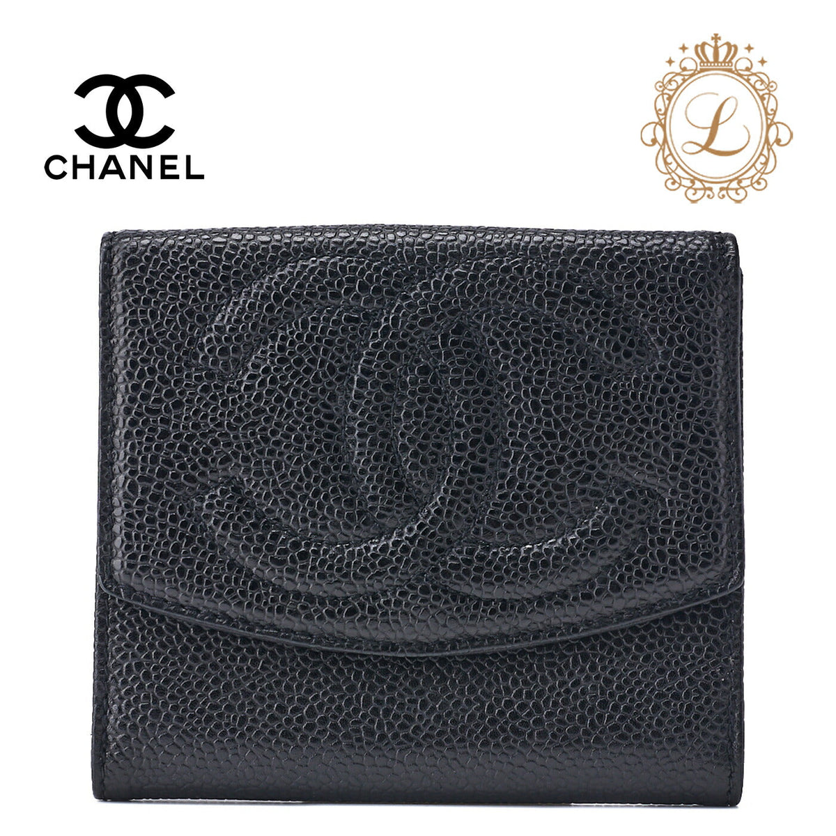 Gebrauchte Bi-Fold Geldbörse Coco Mark Caviar Skin Schwarz Goldfarbene Hardware Gebraucht