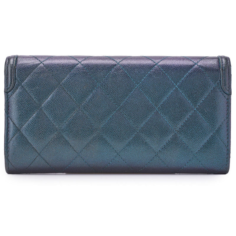 Gebrauchte Bi-Fold Lange Geldbörse Matelasse CC Filigrane Kaviarhaut Metallic Grün Silberfarbene Hardware Gebraucht