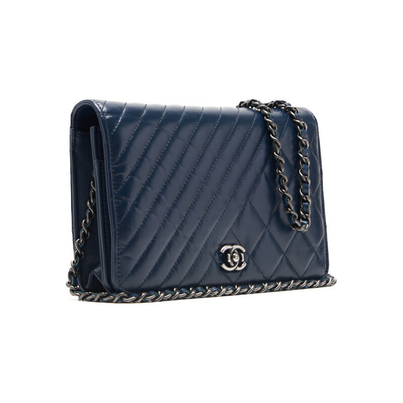 Gebrauchte Geldbörse mit Kette, Diagonale Nähte, Matelassé, Lammleder, Blau, Silberfarbene Metallteile, Gebraucht