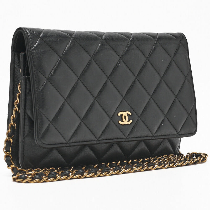 Pre-Owned Chain Wallet Matelassé Lammleder Schwarz Goldfarbene Hardware Pre-Owned