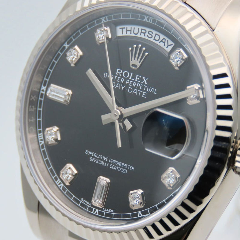 Pre-Owned Rolex Day-Date Watch 118239A, 18K White Gold with Diamonds, Approximately 170.8g, Silver, Black Dial, Roulette, 8PD, 2-Piece Bucket, Men's, ROLEX